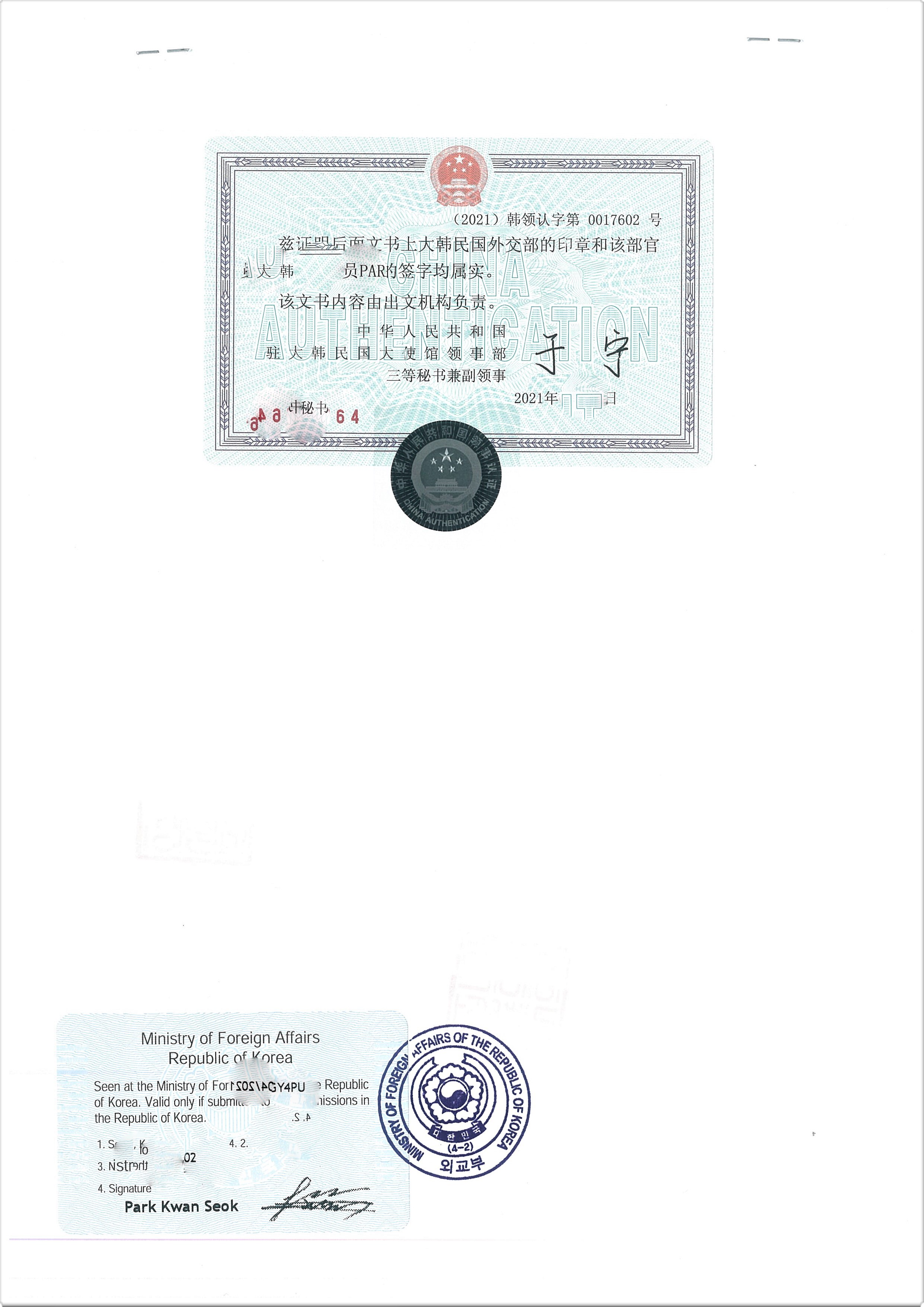 한국에서 중국으로 한국 서류를 중국에 제출할 경우 |